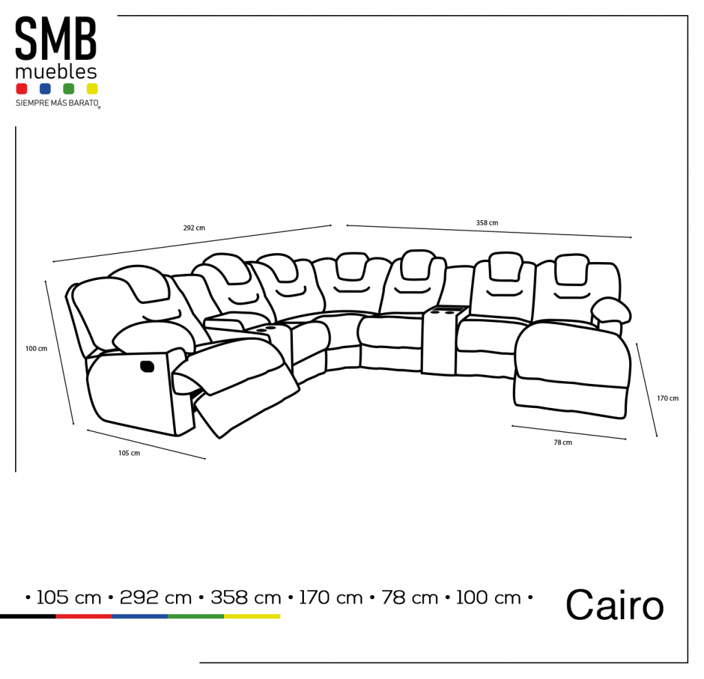 Sala esquinera conformada por un sillon reclinable con 3 niveles de inclinación, loveseat, loveseat con chaiselong, 4 portavasos baúl de almacenaje con descansa brazos, y compartimiento abierto de almacenaje.