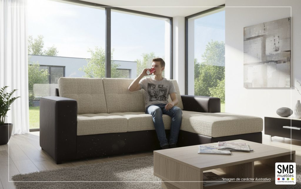 Sala compuesta por loveseat y chaise long tapizado en loneta de alta calidad y vinil 100% poliéster, 6 diferentes colores.
