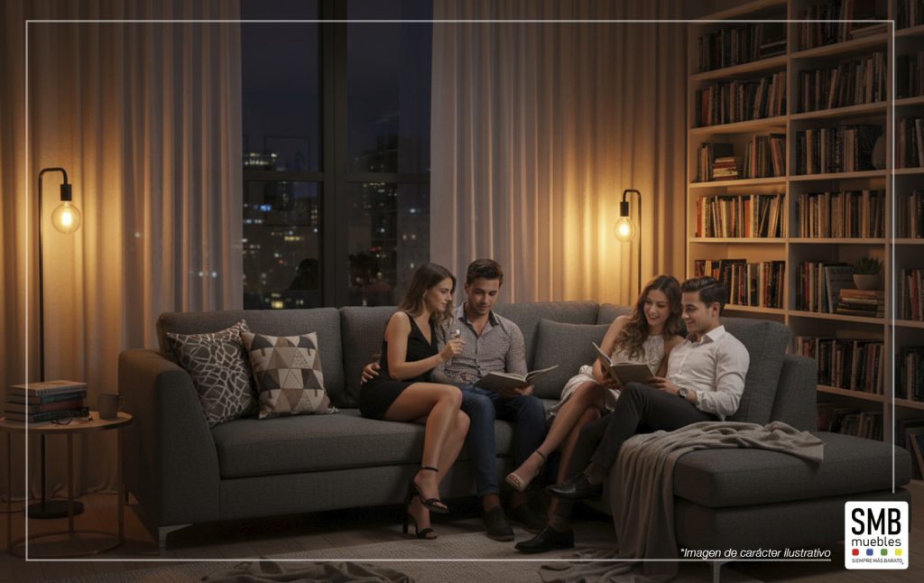 Sala compuesta por sofá y chaise long tapizado en loneta de alta calidad 100% poliéster, 2 cojines decorativos 6 diferentes colores.